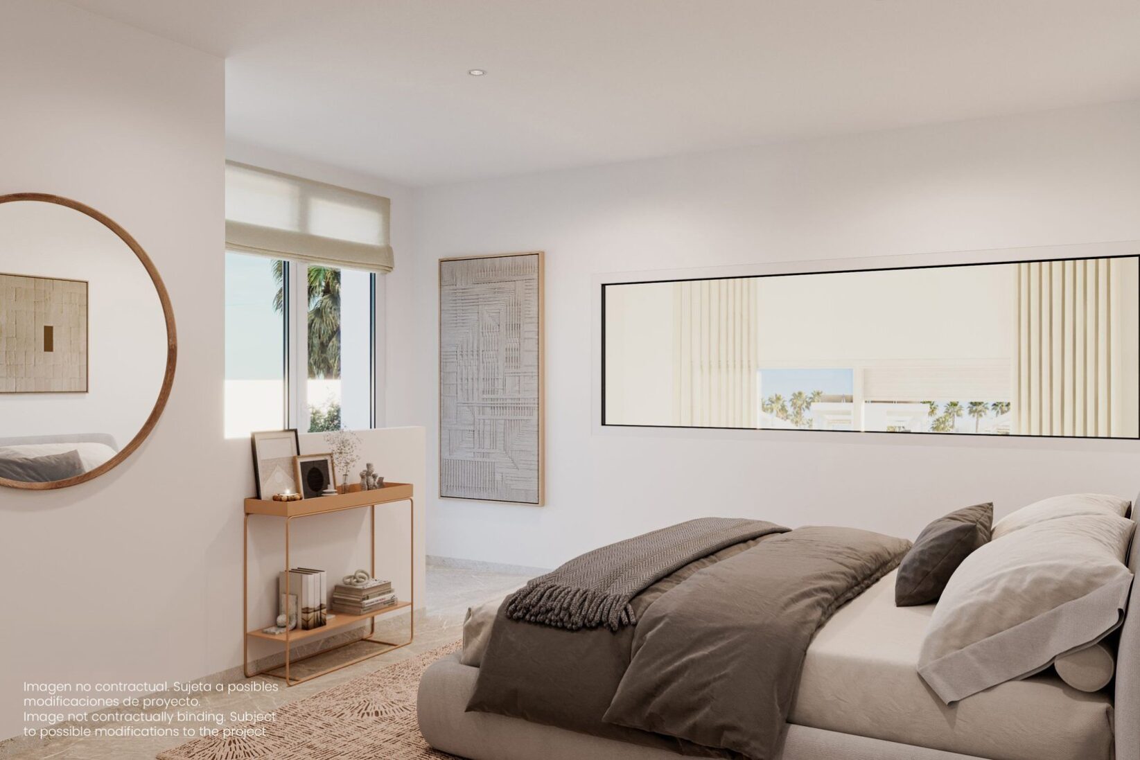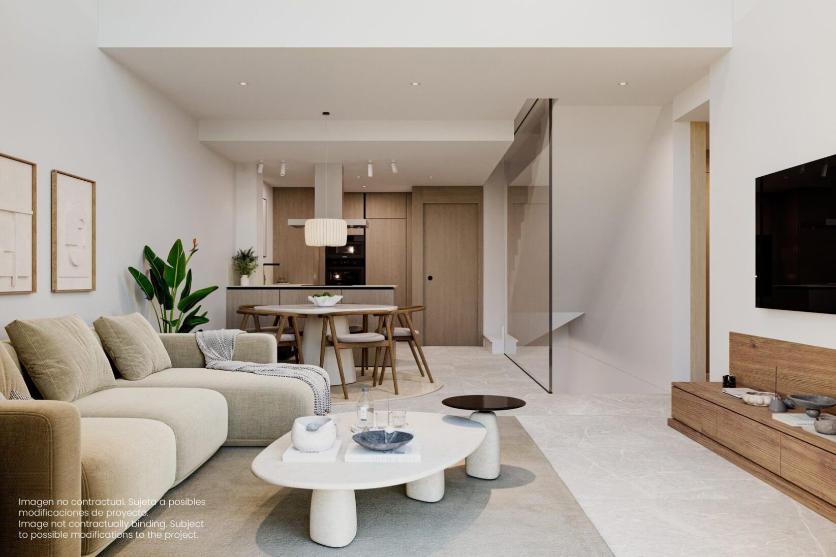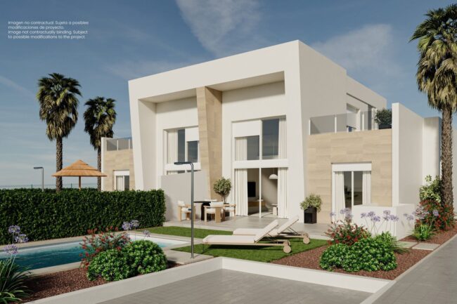 De villa's zijn ontworpen met een moderne esthetiek en een goed doordachte indeling die optimaal gebruik maakt van de beschikbare ruimte. Op de begane grond bevindt zich een ruime en lichte woon-eetkamer met een open keuken en een Amerikaanse bar. Deze open inrichting creëert een harmonieuze en verbonden leefruimte die ideaal is voor zowel familie als sociaal gebruik. Vanuit de woonkamer is er directe toegang tot een privé tuin met een zwembad, perfect om het hele jaar door te genieten van het mediterrane klimaat.