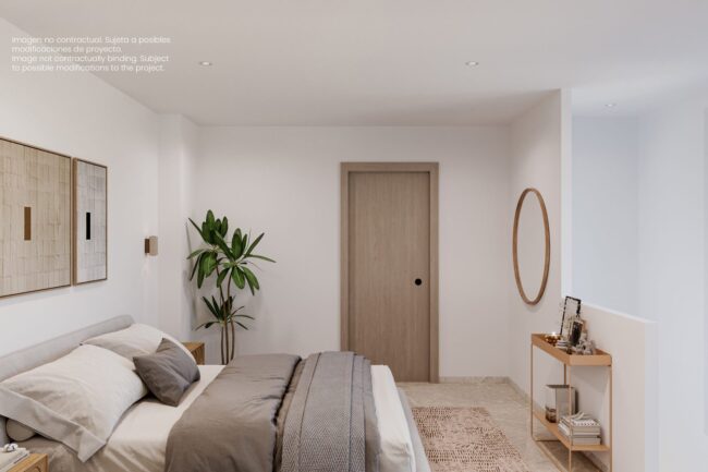 De begane grond herbergt ook twee slaapkamers met inbouwkasten en een volledig uitgeruste badkamer. Deze ruimte biedt extra comfort en efficiëntie dankzij de vloerverwarming. Op de bovenverdieping bevindt zich de hoofdslaapkamer met een eigen badkamer en een privé solarium, een ideale plek om te ontspannen en te genieten van het uitzicht op de omgeving.
