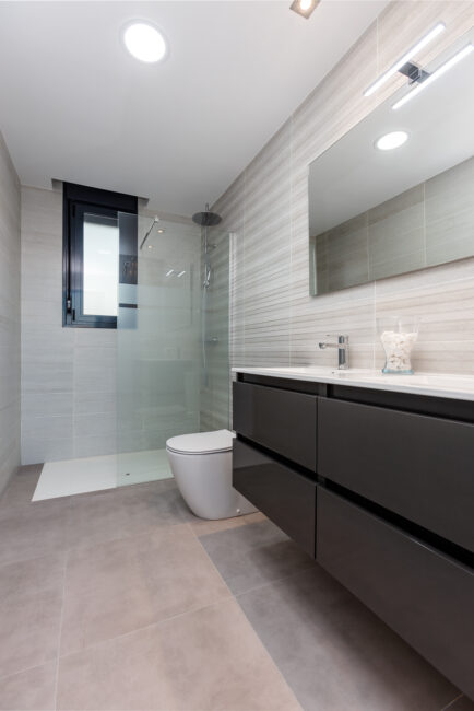 De villa's zijn voorzien van een indrukwekkende woonkamer met dubbele hoogte en badkamers met veel natuurlijk licht. De gevel heeft een totale dikte van 25 cm, inclusief hoogwaardige isolatie voor optimaal thermisch en akoestisch comfort. De badkamers zijn betegeld met eersteklas tegels, terwijl de vloeren en keukens zijn uitgerust met grootformaat keramische tegels voor een verfijnde uitstraling.Uitstekende Locatie in een Rustige Omgeving