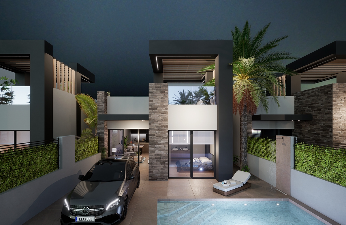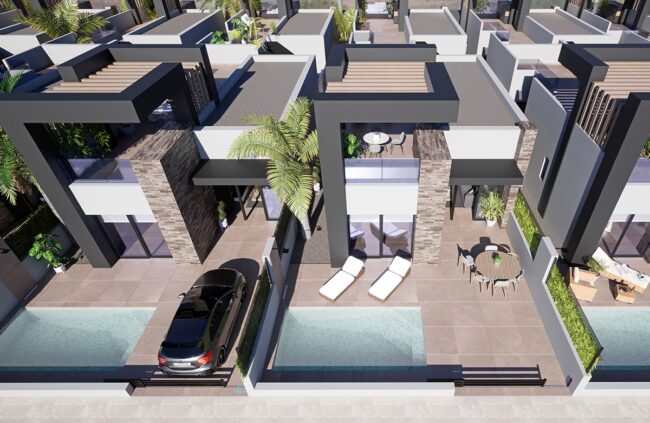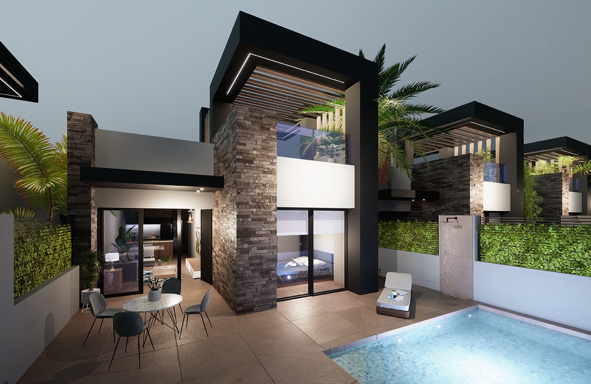 De villa's beschikken over drie ruime slaapkamers en twee badkamers, waarvan één en suite bij de master bedroom. Alle kamers zijn voorzien van ingebouwde kledingkasten. De woon- en eetkamer heeft een elegante open keuken met een ontbijtbar. Door de verhoogde plafonds ontstaat een gevoel van ruimte en licht. De villa's zijn gelijkvloers, wat zorgt voor een harmonieuze integratie met de omgeving, terwijl het ontwerp zeker de aandacht trekt door zijn praktische en comfortabele inrichting.