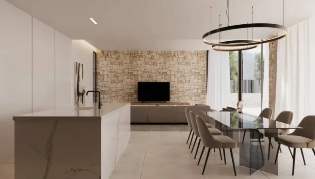 Ontdek een prachtige moderne vrijstaande villa in het charmante stadje Dénia, gelegen aan de populaire Costa Blanca. Deze villa biedt 235 m² aan woonruimte en een overdekt terras, perfect geïntegreerd in een ruime kavel van 716,33 m². Het eigentijdse ontwerp van de villa combineert strakke lijnen met natuurlijke materialen zoals steen en hout, die de gevel een unieke uitstraling geven.